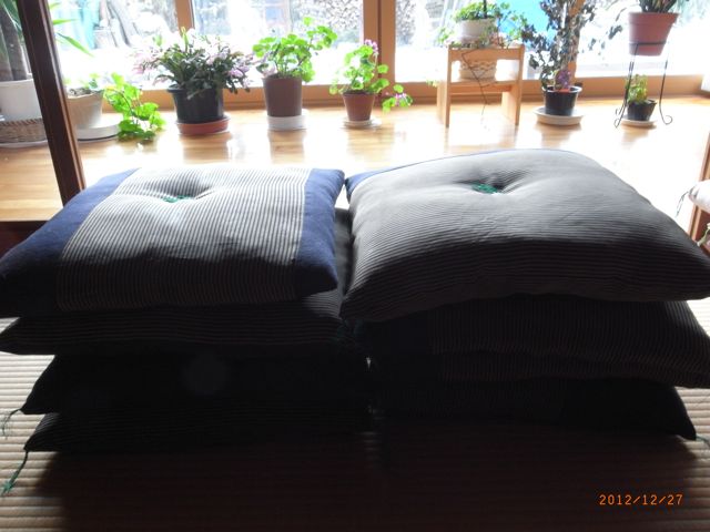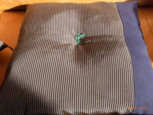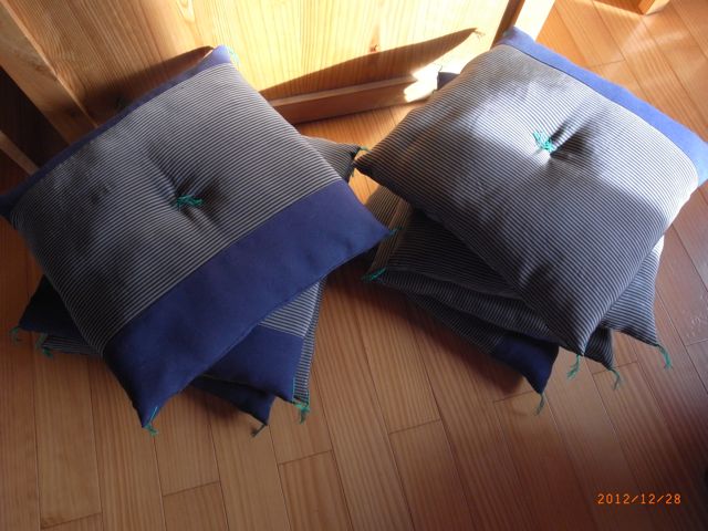 すてきな座布団でしょ。この座布団、未使用の丹前をほどいて作ったんです。表地と裏地をつかってね。ミシンかけは友だちのタカちゃん。わたしは綿入れと最後の仕上げ。